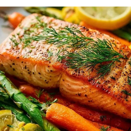 Oven Ready lemon dill salmon + roasted seasoned asparagus and baby potatoes